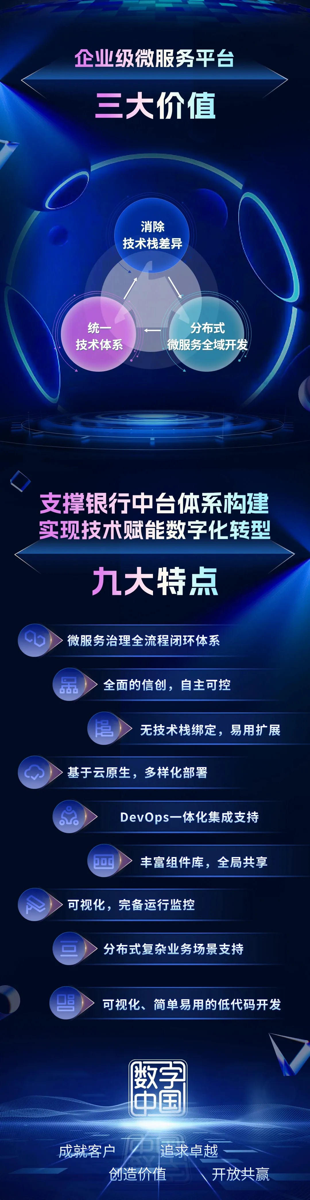 神州信息企业级微服务平台作为面向金融行业打造,具有自主知识产权金融架构级软件解决方案,提供更加宽泛与灵活的复用能力,基础平台组件管理上收,技术能力统一,实现统一的微服务架构技术方案。同时,提供具有兼容企业内部多种异构微服务开发框架,实现互联互通;提供开发脚手架,助力企业快速构建微服务;支持Service Mesh架构将微服务治理统一下沉到边车,对传统系统进行微服务赋能;支持云上云下、混合云、PaaS、CaaS等多种模式系统间互联互通;支持多域多中心;实现全行级基础技术组件统一,微服务治理能力统一管理与监控等特性功能。